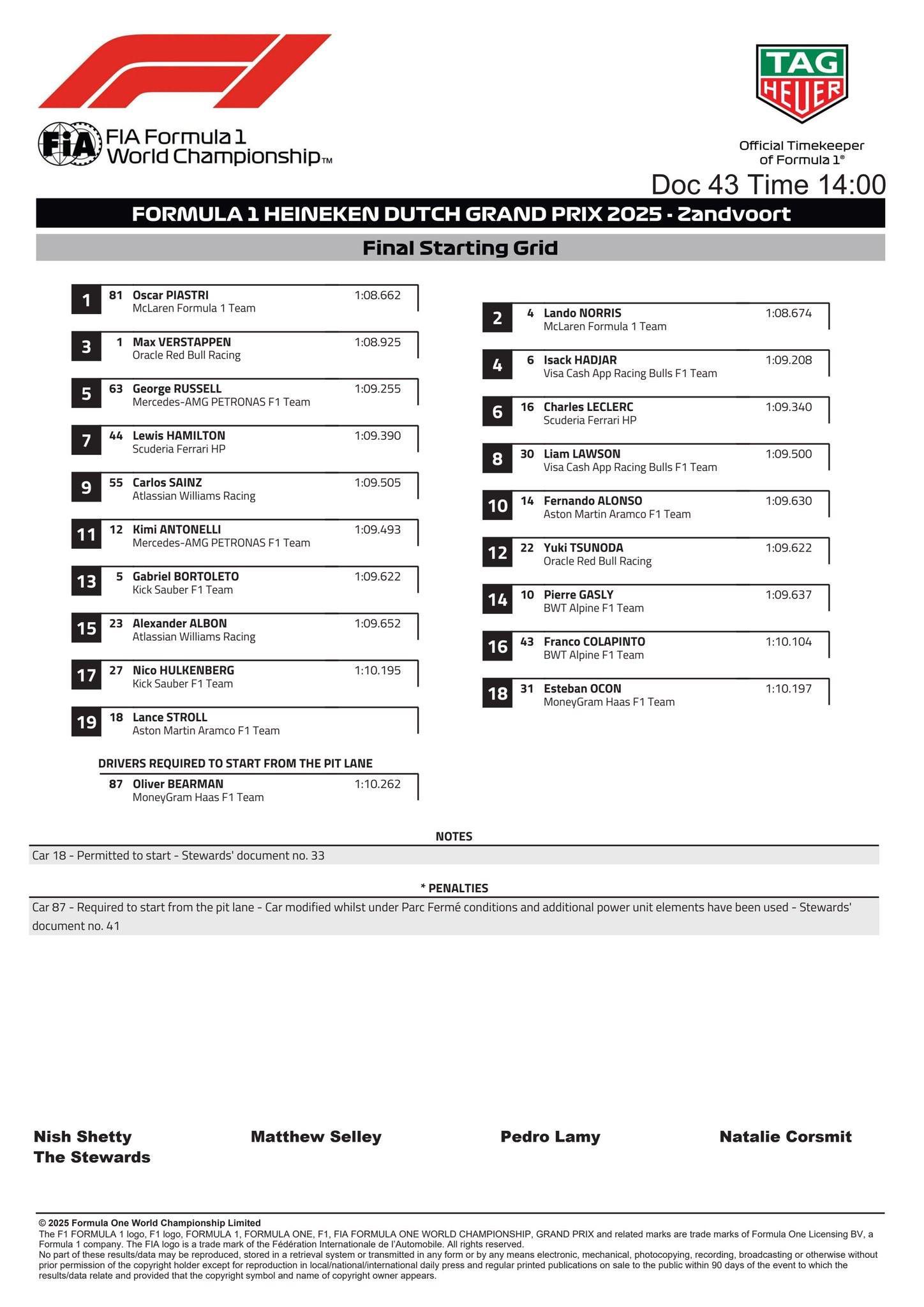 两台迈凯伦头排起步,身后的则是维斯塔潘与哈贾尔。拉塞尔、勒克莱尔处在第三排,汉密尔顿、劳森第四排,塞恩斯、阿隆索第五排,贝尔曼维修区起步。