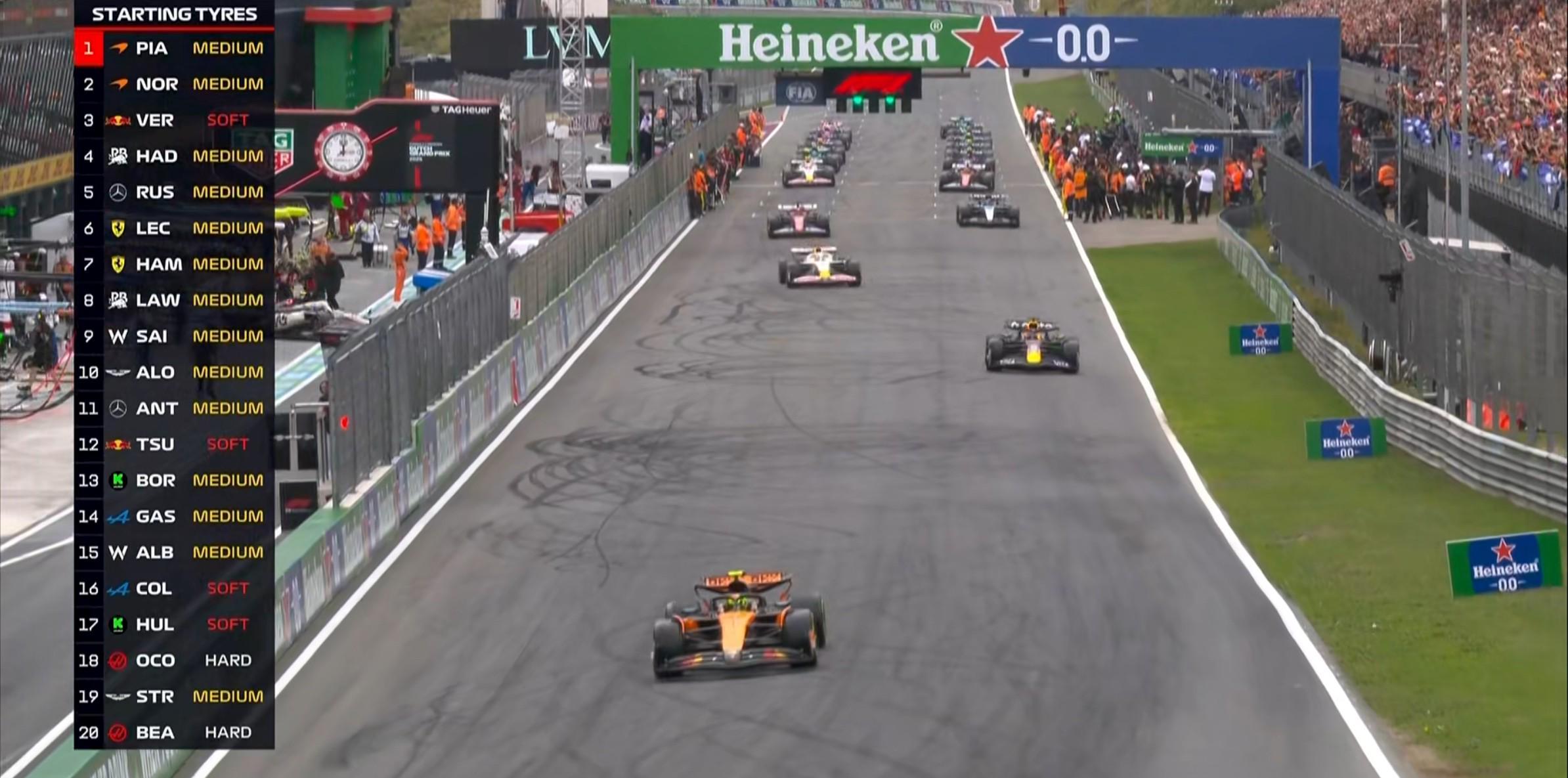 起步轮胎方面:前10名中仅维斯塔潘软胎起步,奥康、贝尔曼选用硬胎,其余多数车手选用中性胎;
