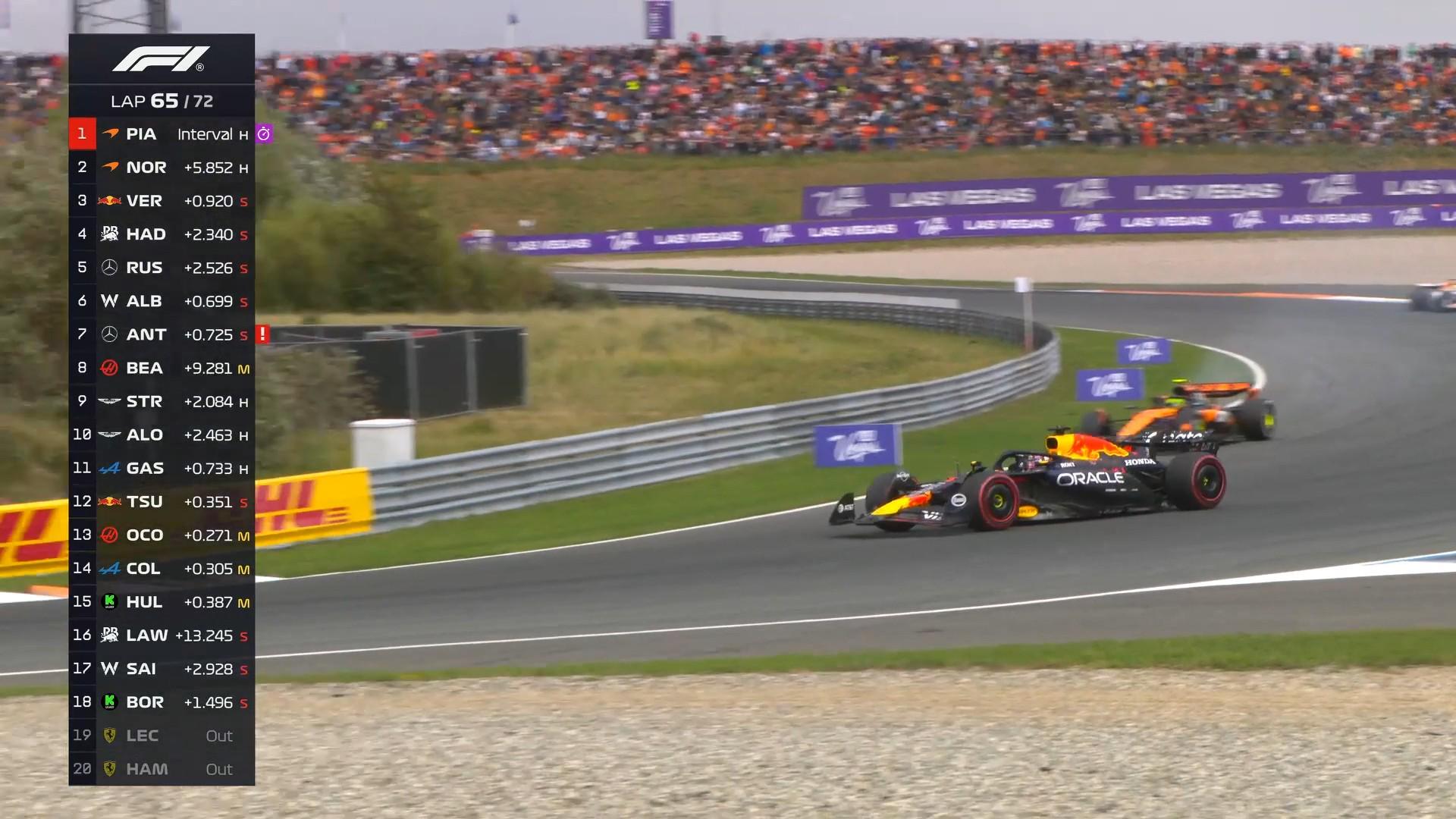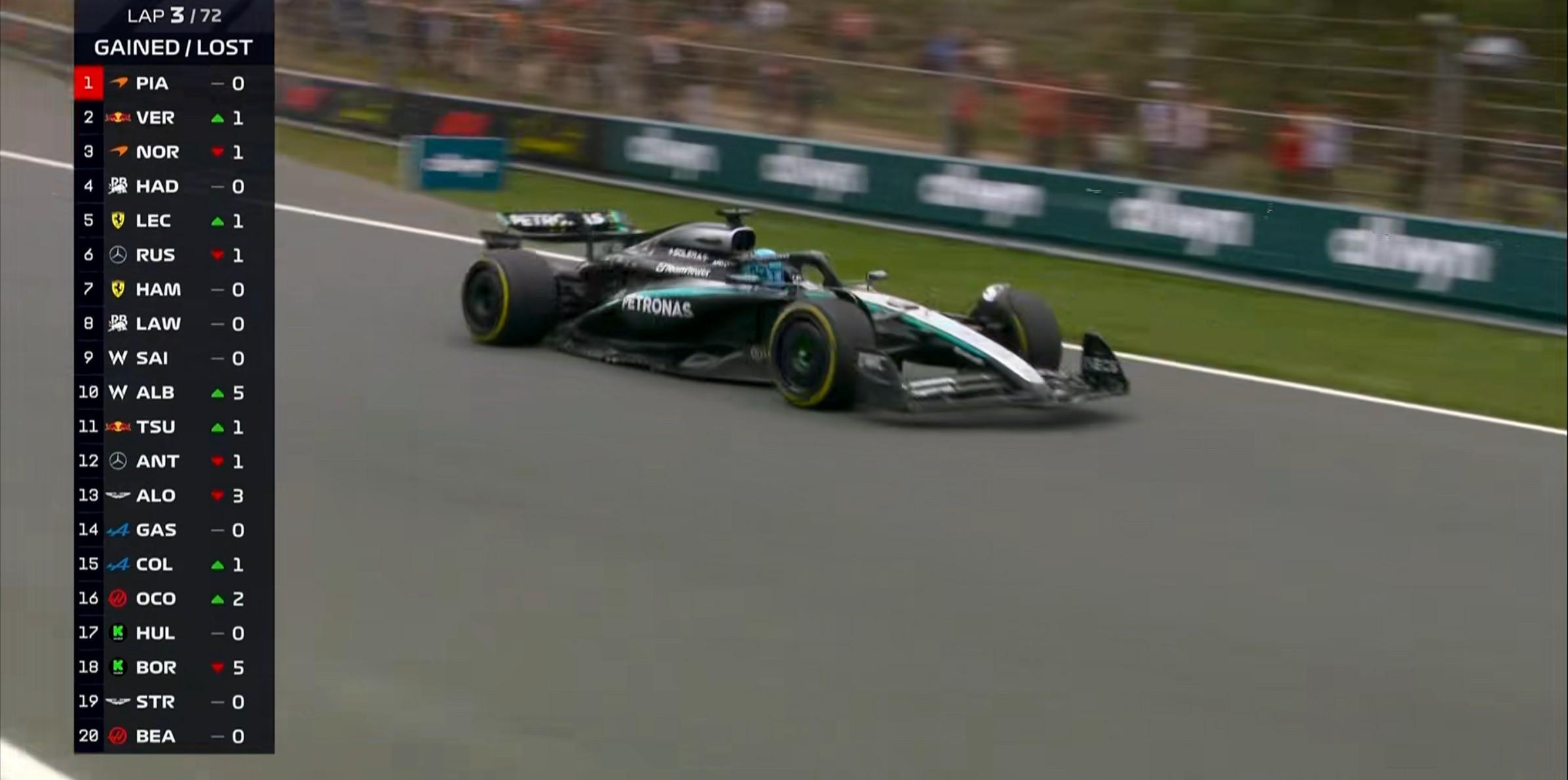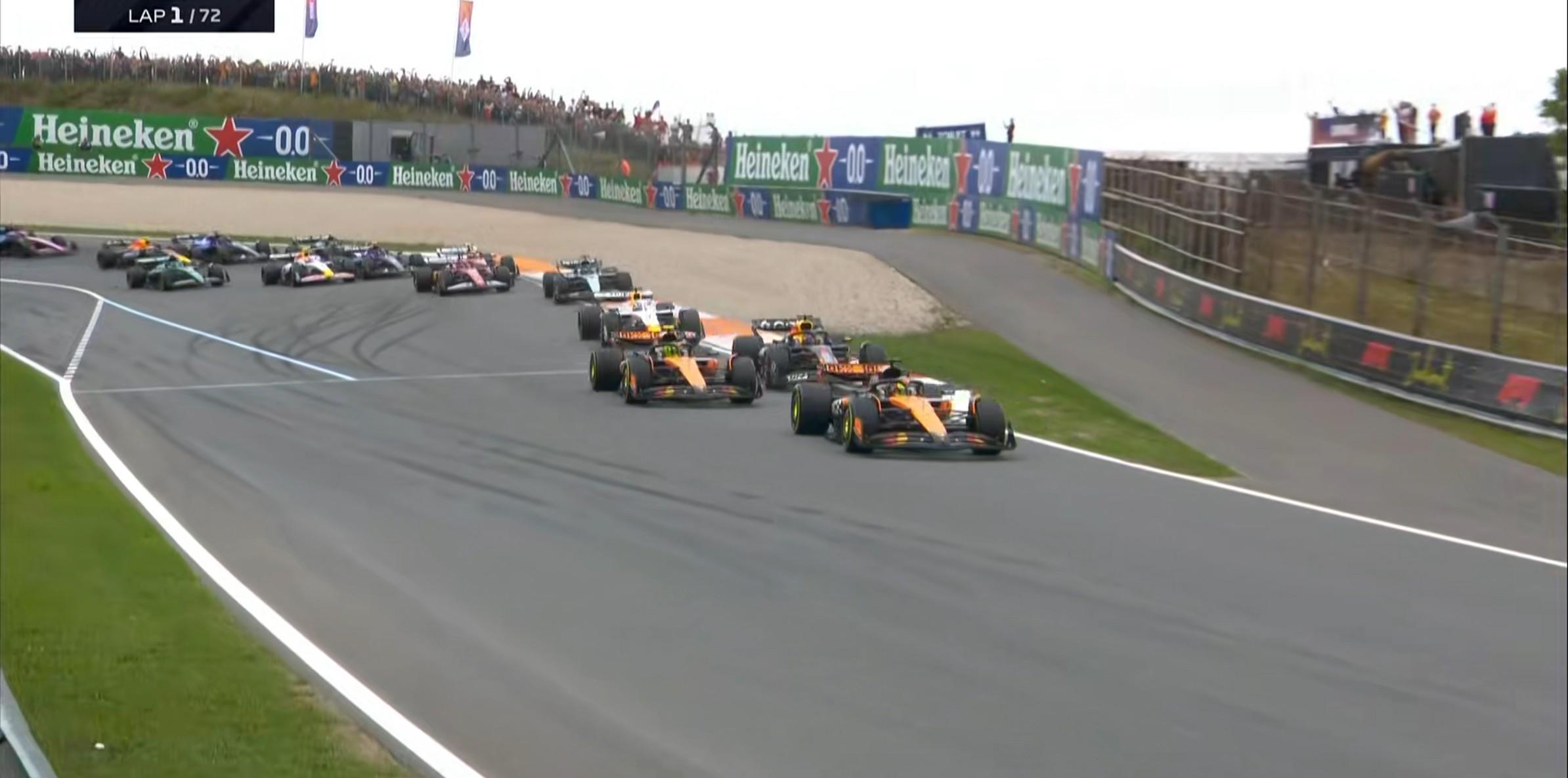 起步方面:维斯塔潘在2号弯前卡住内线,并在4号弯超越诺里斯上升至第2!