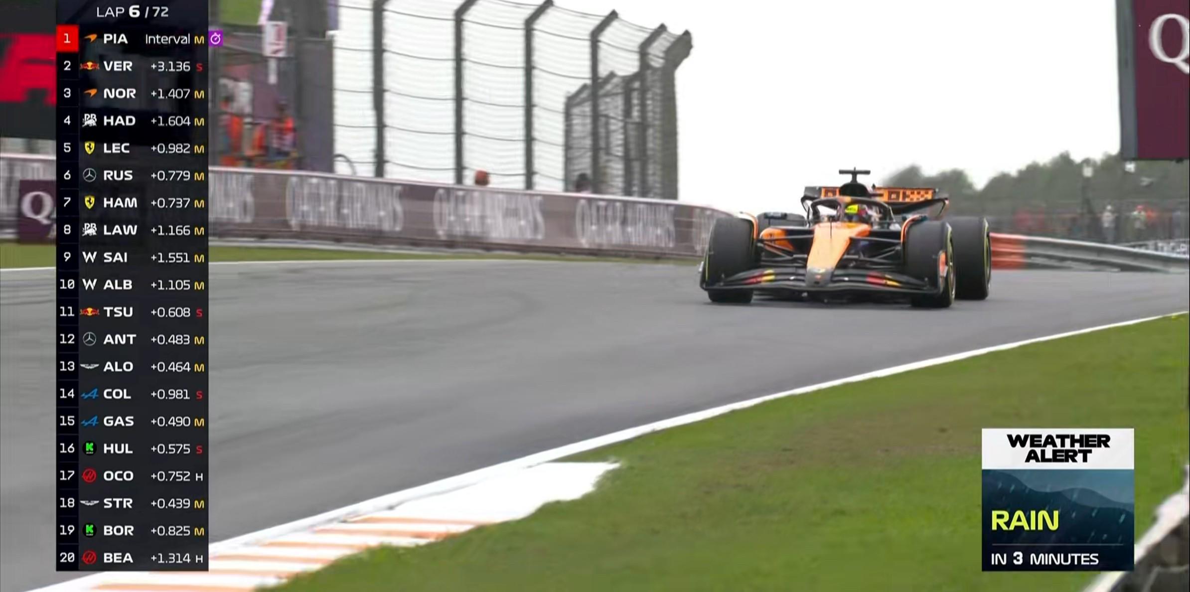 第6圈:官方天气预报3分钟后将出现降雨,皮亚斯特里持续刷新最快圈;
