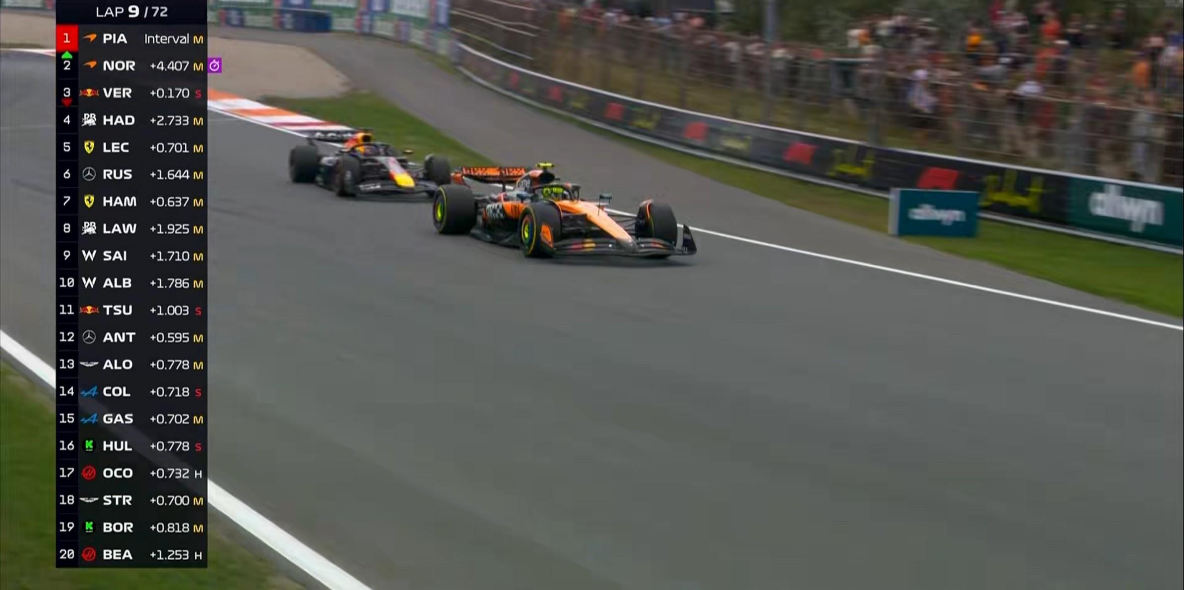 第9圈:诺里斯在1号弯保持在外线强硬完成超越,他与队友的差距目前为4.5秒;