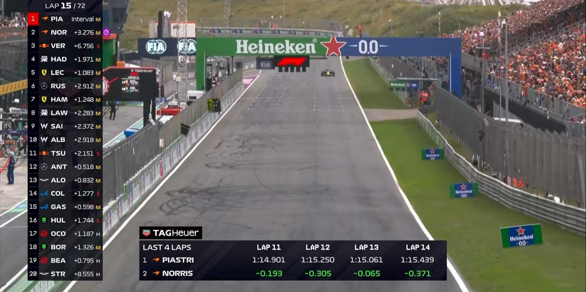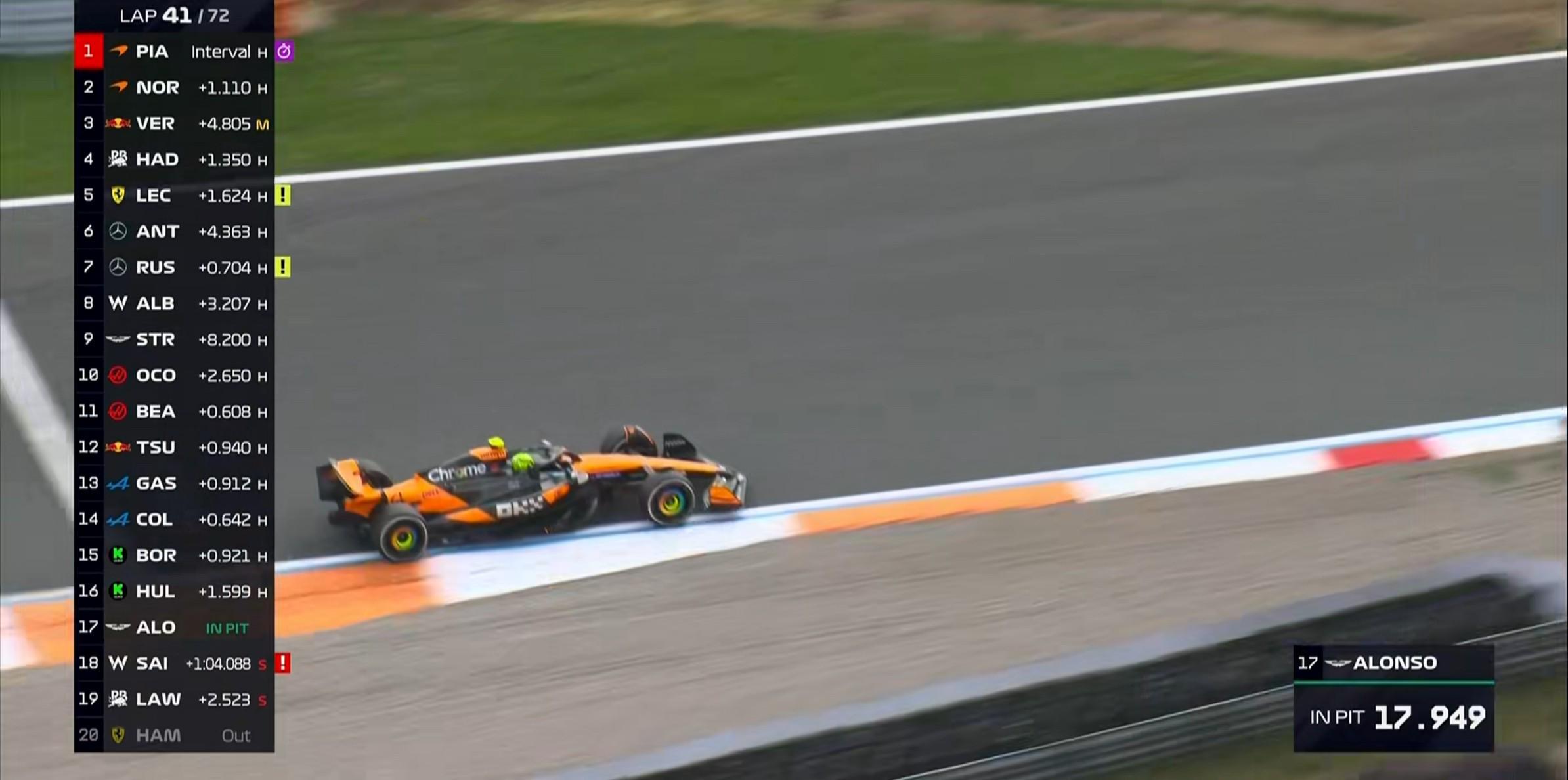 第4圈:维斯塔潘难以匹配皮亚斯特里的长距离节奏,已经被后者甩开2秒;