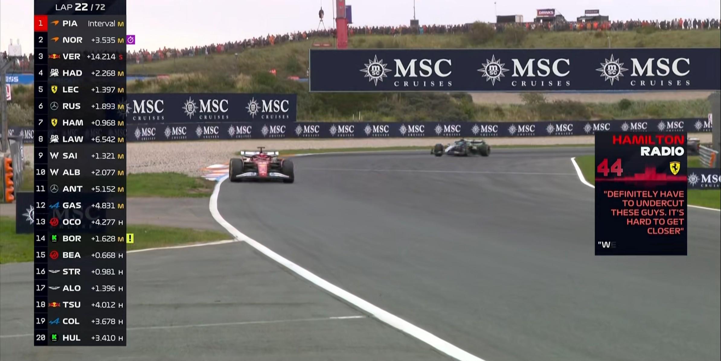 第22圈:汉密尔顿告知车队很难完成超越,需要通过undercut来