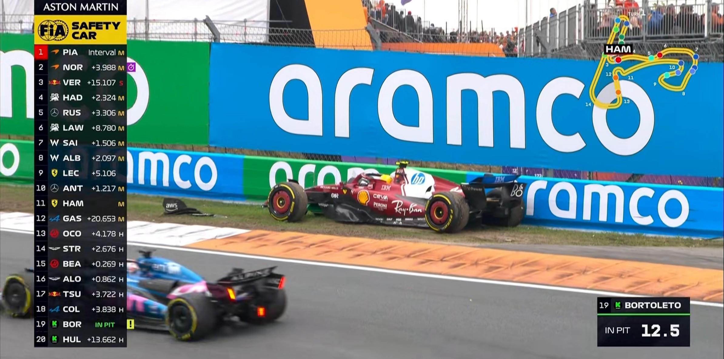 第23圈:汉密尔顿在3号弯失控上墙,赛车前翼及悬挂严重受损!