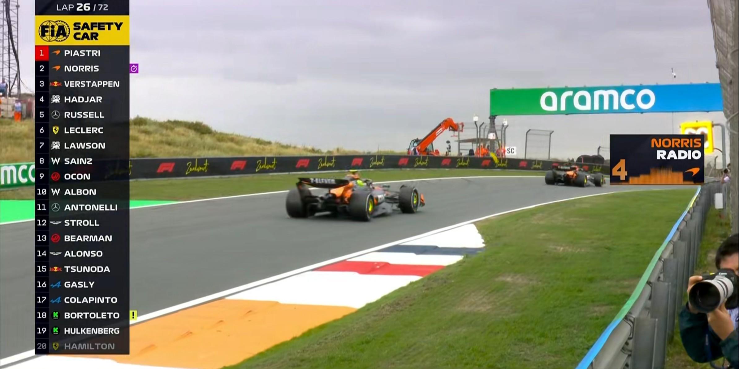 第26圈:诺里斯向工程师询问汉密尔顿上墙的原因,并希望工程师持续反馈赛道的状况;