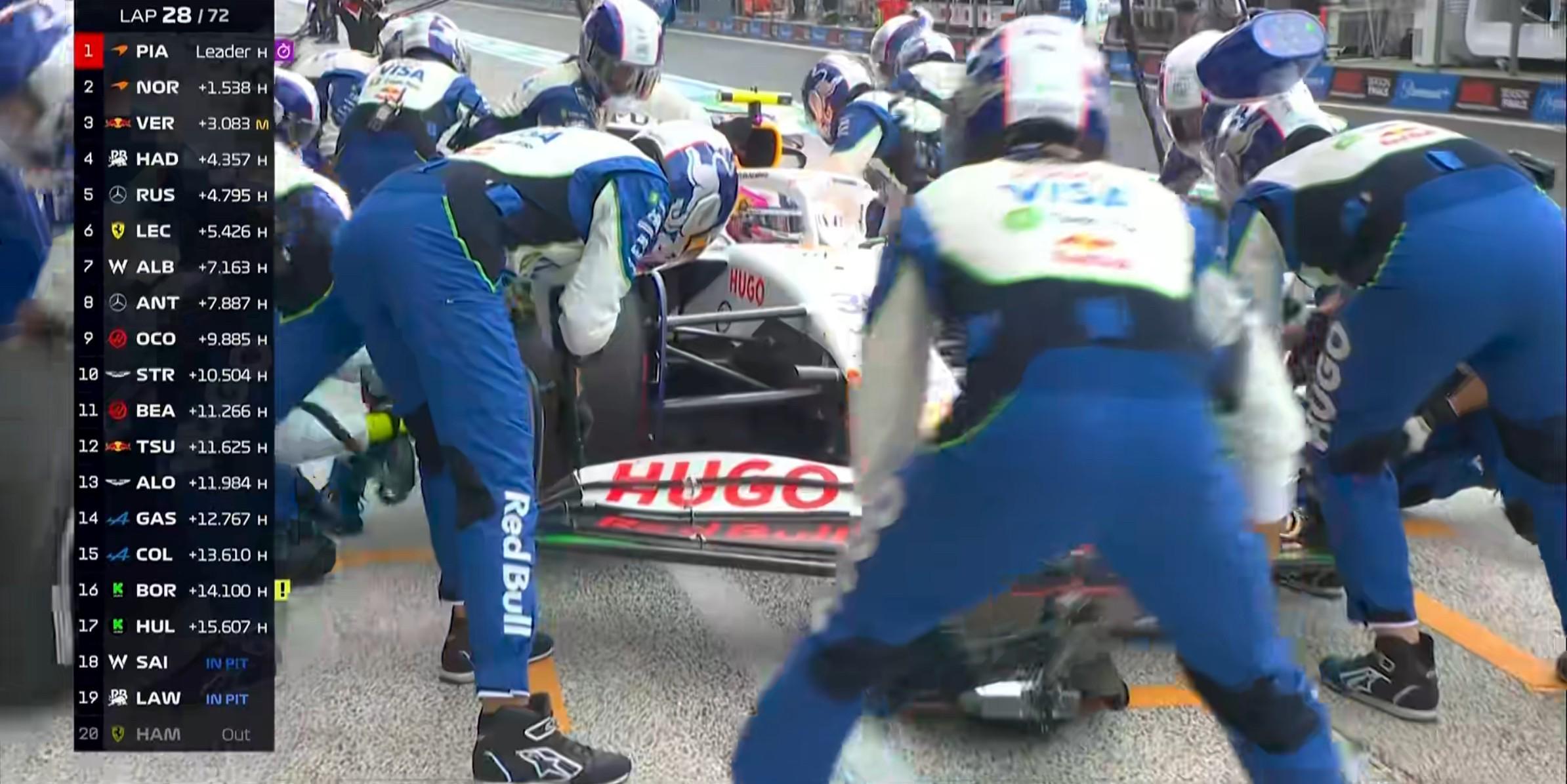 第28圈:爆胎的二位车手进站完成二停,出站后已被皮亚斯特里套圈;