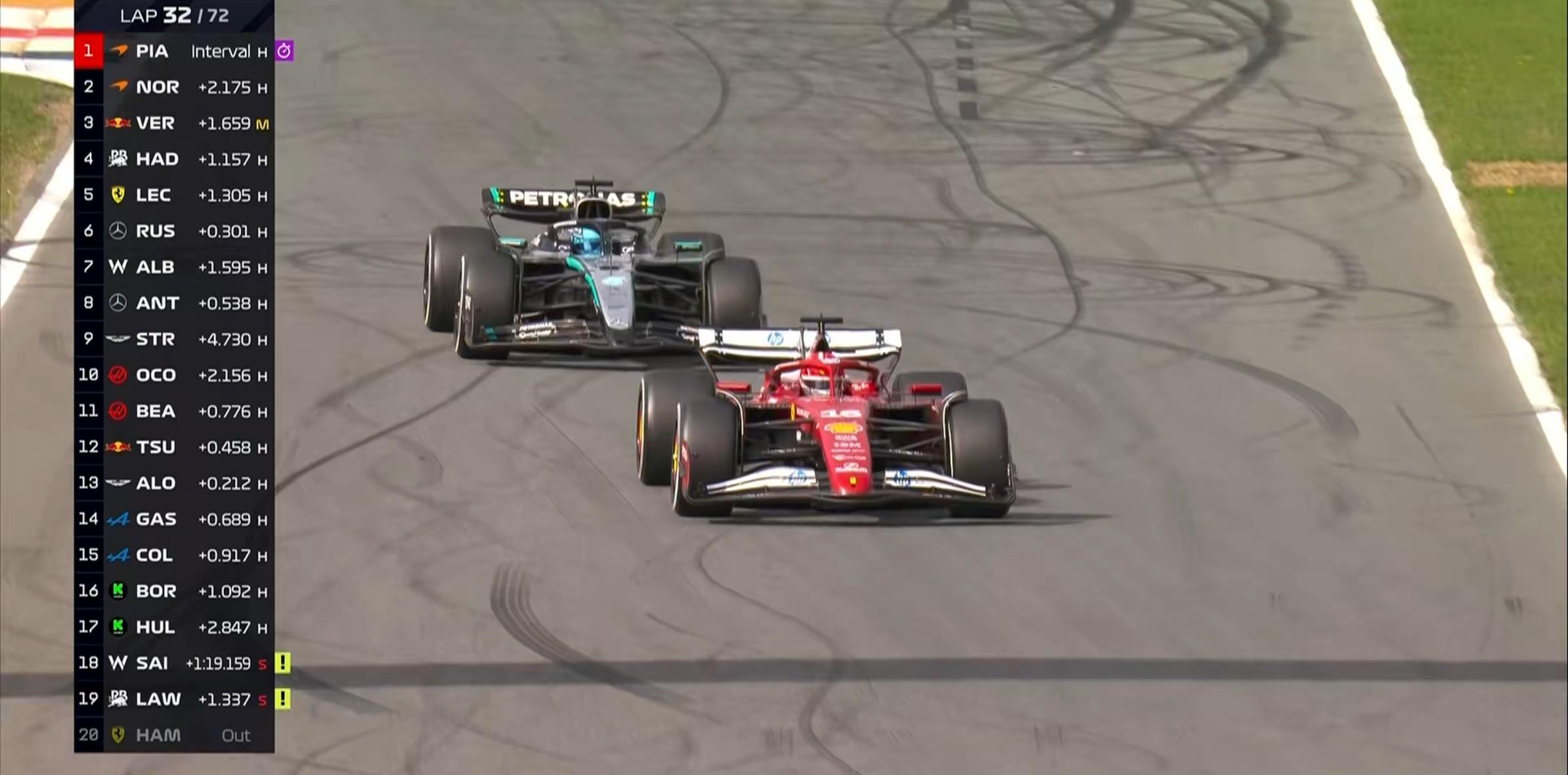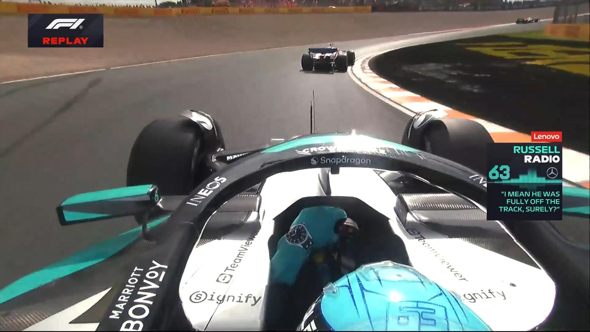 拉塞尔向车队报告勒克莱尔存在四轮出白线超越的情况,赛会对此展开调查;