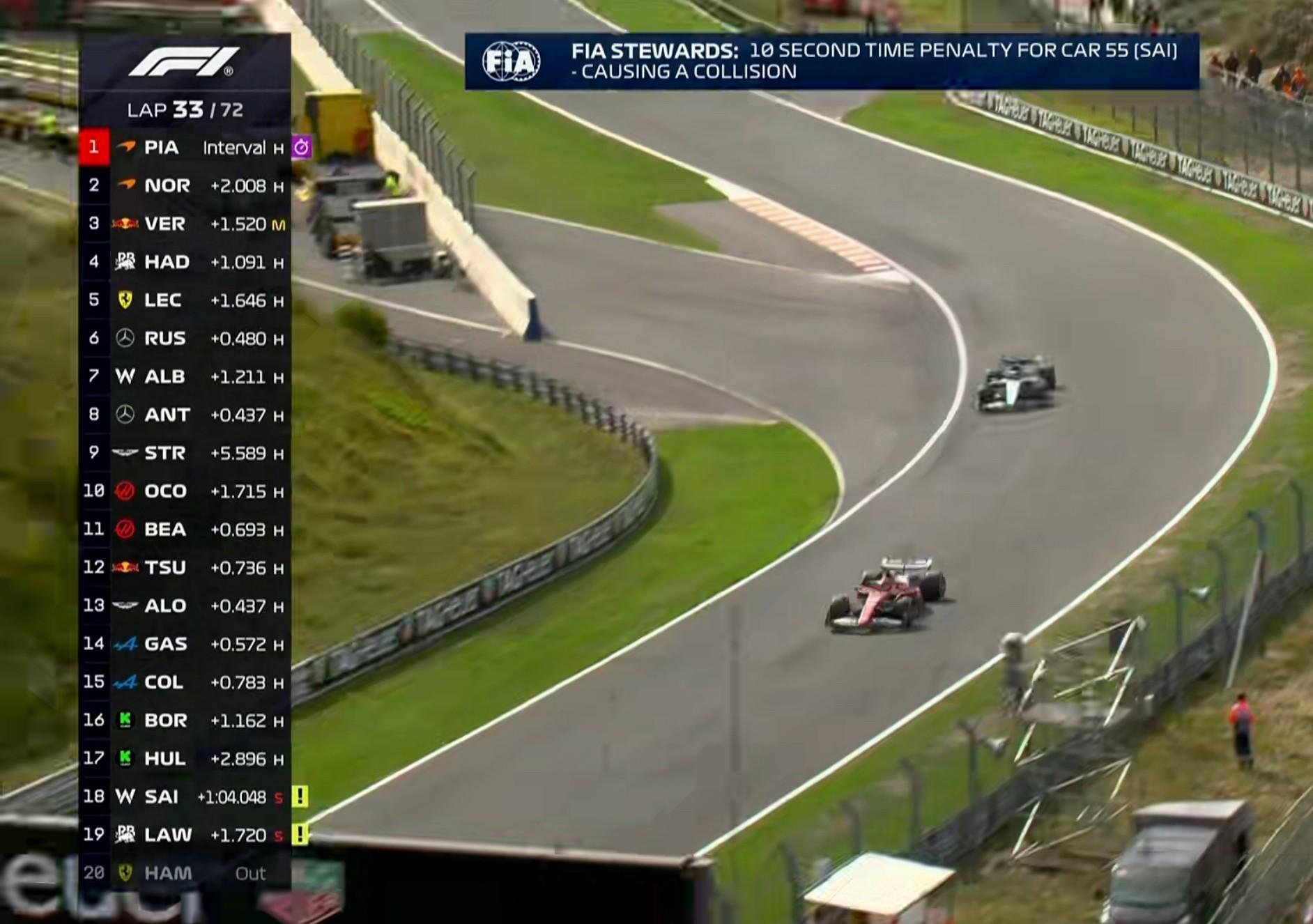 第33圈:塞恩斯因之前的事故被赛会罚时10秒!