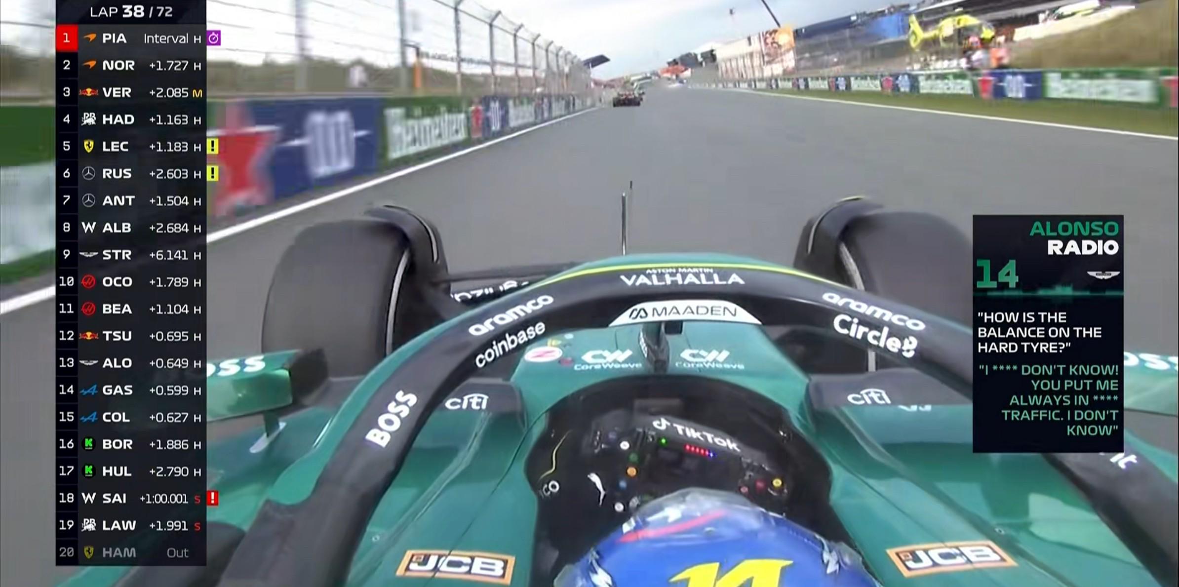 第38圈:工程师询问阿隆索赛车的平衡如何,后者表示车队的策略又将自己放在车阵中,他对此很不满;