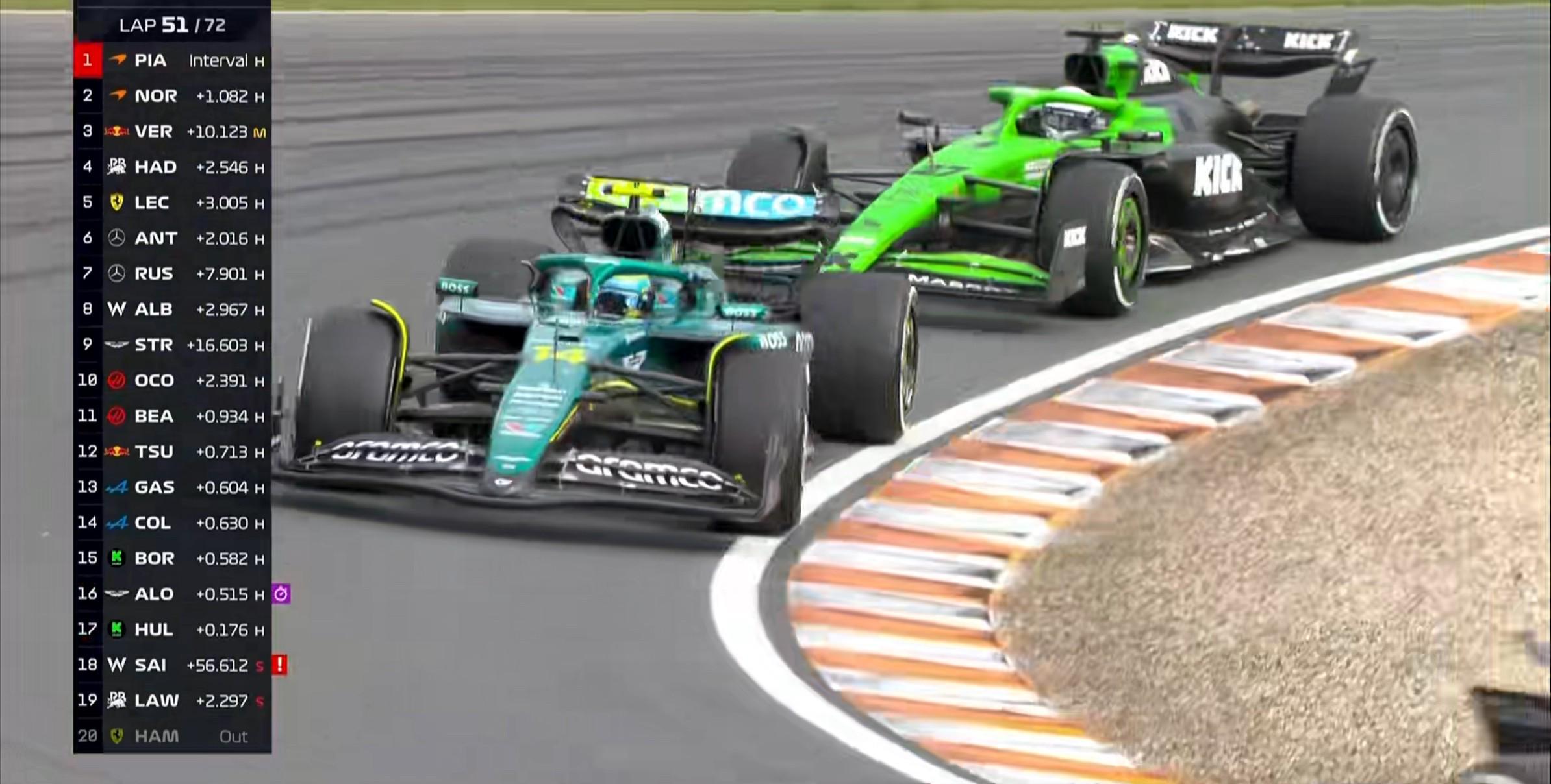 第51圈:阿隆索在11号弯挤进内线超越霍肯博格,上升至第16;